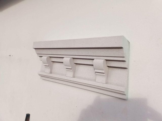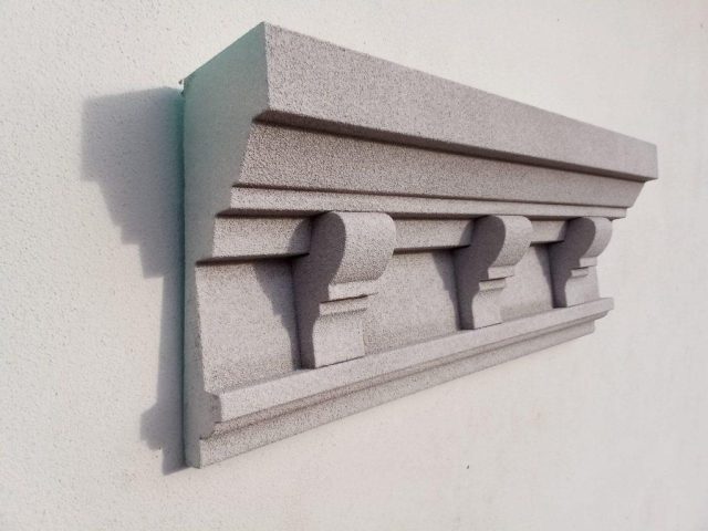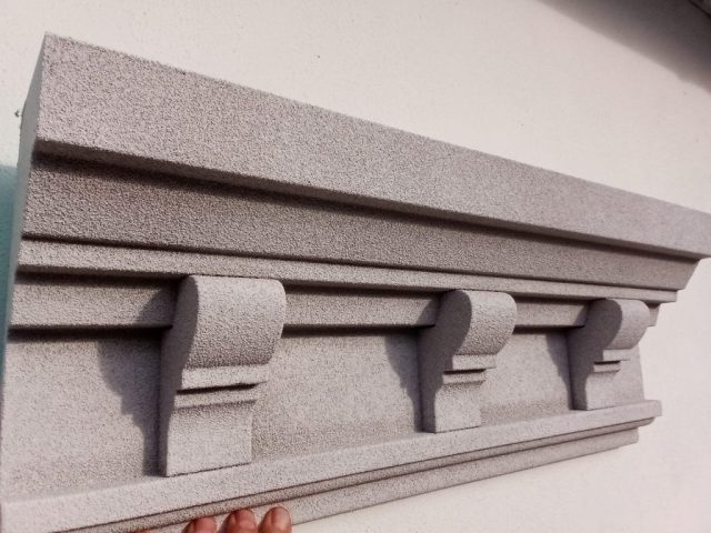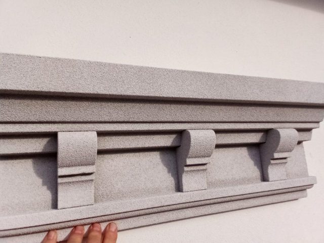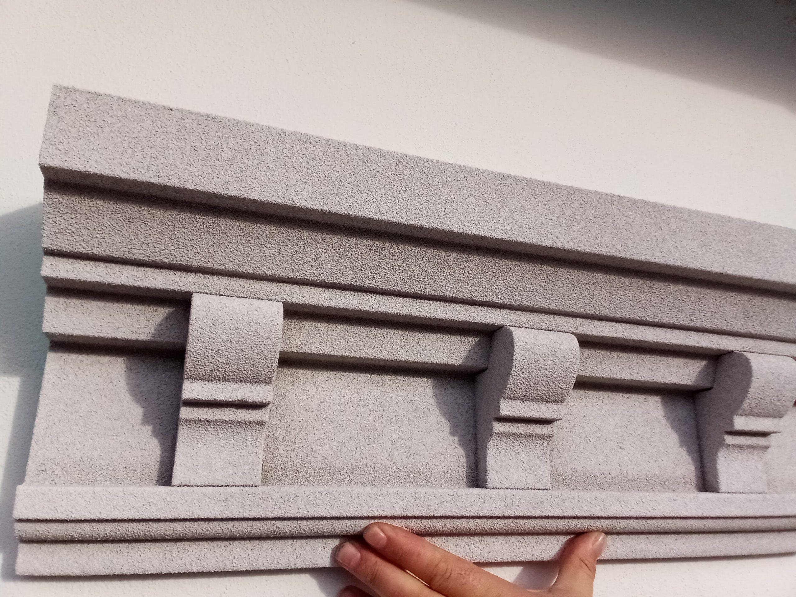Cornișe decorativă realizată din polistiren extrudat, acoperită cu strat protector din rășină și sort nisip. Dimensiuni secțiune 25 x 14 cm.