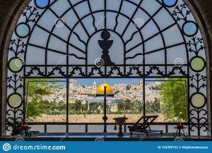 Forma de lacrimă a bisericii este sugestivă. Un perete de sticlă oferă o panoramă a Ierusalimului vechi, aflat pe colina din față. Și pelerinii de azi privesc Ierusalimul din acest loc, precum Mântuitorul odinioară. Însă acum se vede altceva. Domul auriu este moscheea care pentru musulmani indică înălțarea profetului Mahomed la cer. În plan mai îndepărtat, înspre dreapta, cu două cupole albăstrui, este biserica Învierii Domnului, pe care o vom prezenta într-un articol viitor.
