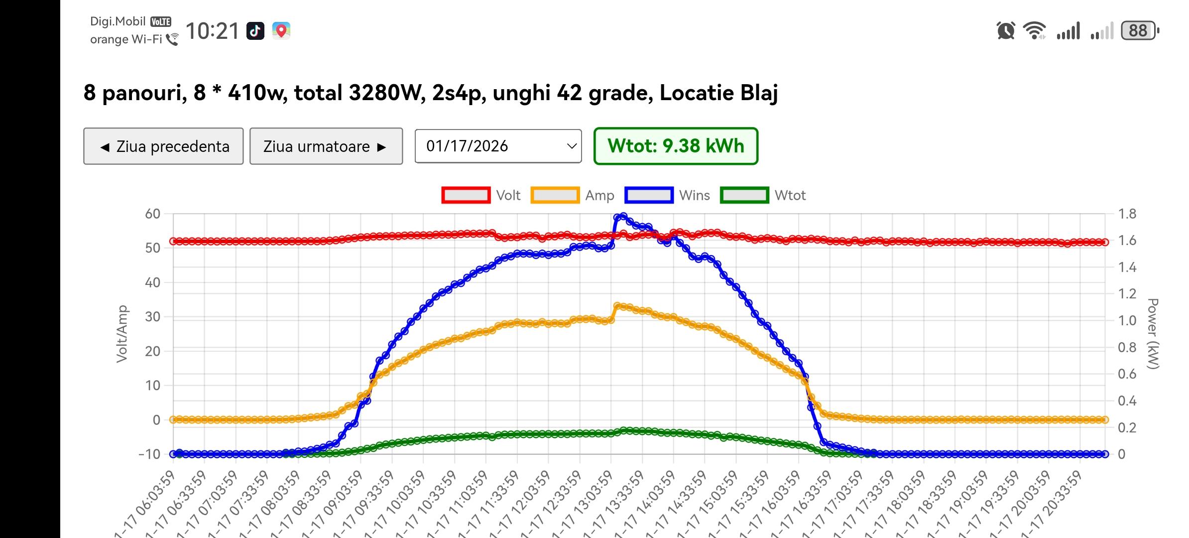 Ziua fiind in crestere, cerul aproape complet liber, conditii tot mai bune pentru productie din fotovoltaice. Chiar daca este frig de crapa pietrele si panourile partial acoperite de zapada, am realizat o productie de ~ 10 kw din panourile electrice.