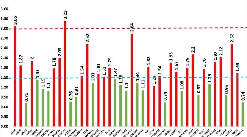 Coeficientul infectărilor cumulate la 14 zile, raportate la 1.000 de locuitori, calculat de către Direcțiile de Sănătate Publică, la nivelul Municipiului București și al județelor este următorul: