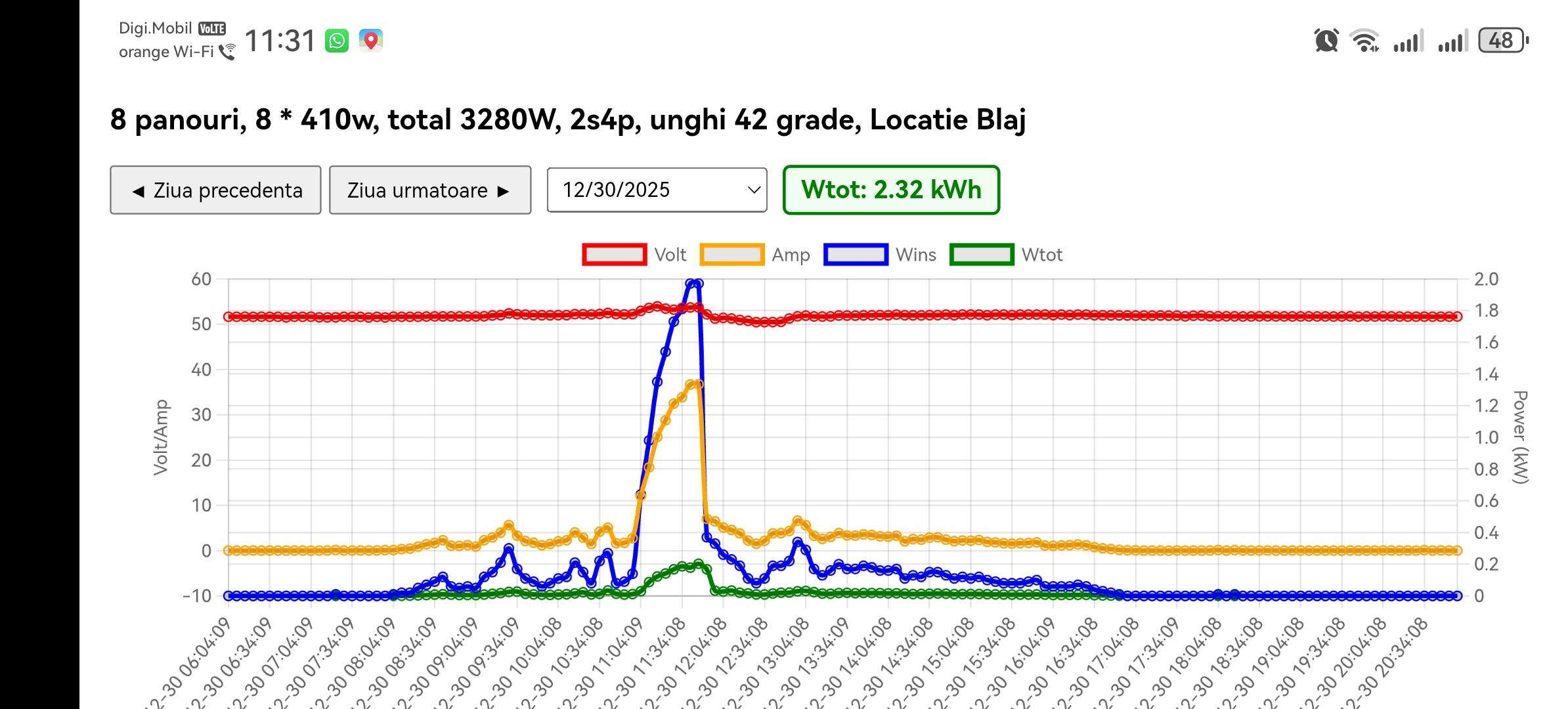 Diverse Penultima zi din an, productie curent 31 decembrie 2025 Dj Gheorghe În 30 decembrie am avut o producție de curent electric din panouri fotovoltaice de puțin peste 2 kw.