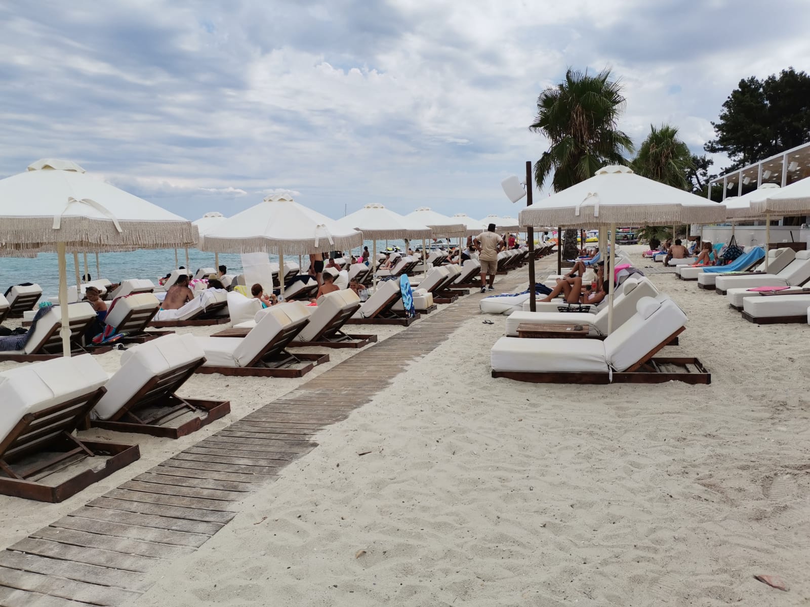 Sunt șezlonguri până în apă. Prețul este destul de piperat, începe de la 30 euro până la 60 euro cele din față.