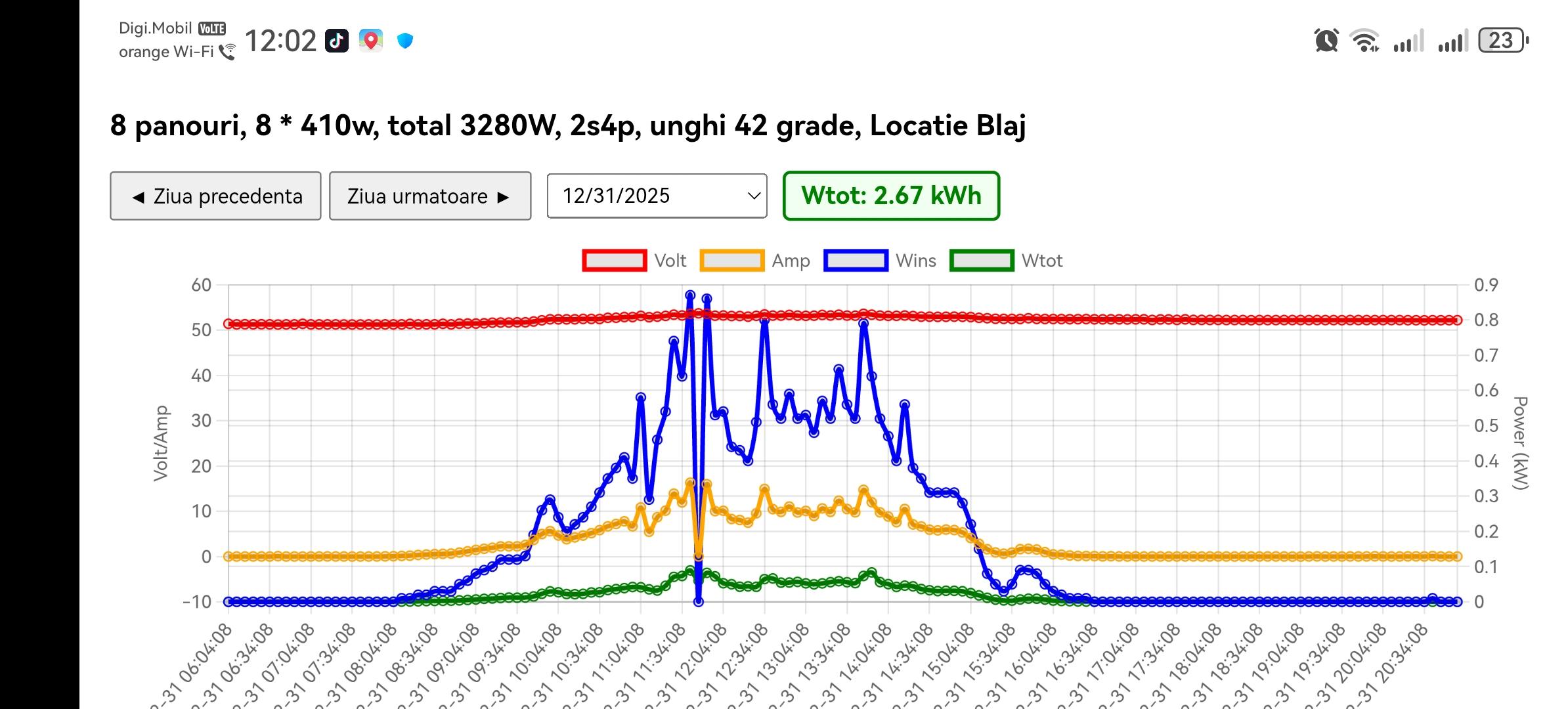 Diverse Producția pe ultima zi din 2025 1 ianuarie 2026 Dj Gheorghe În ultima zi de decembrie și ultima din anul 2025, avem înregistrată o producție de curent electric din panouri fotovoltaice de 2,67 kw.