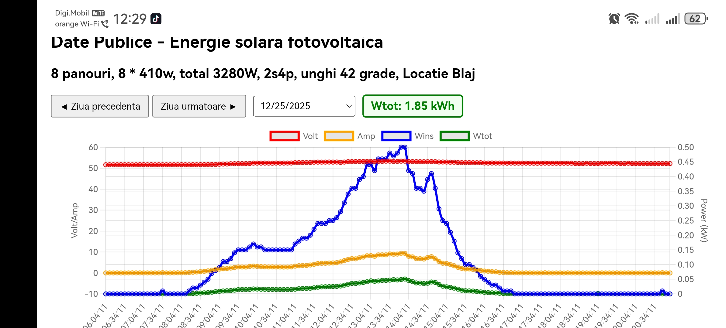 Minima lunii este 0,6 kw, lar maxima 9,87 kw. După cum se poate vedea în graficele de pe dt.st-g.ro avem diferențe foarte mari între zile, la producția de curent electric din cele 8 panouri.