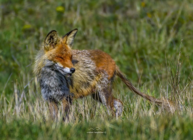 Au trecut încă câteva minute bune, când observ că una dintre vulpițe se rupe de celelalte și pornește agale, căutând prin iarbă, pe o traiectorie cât se poate de neregulată în direcția mea.
